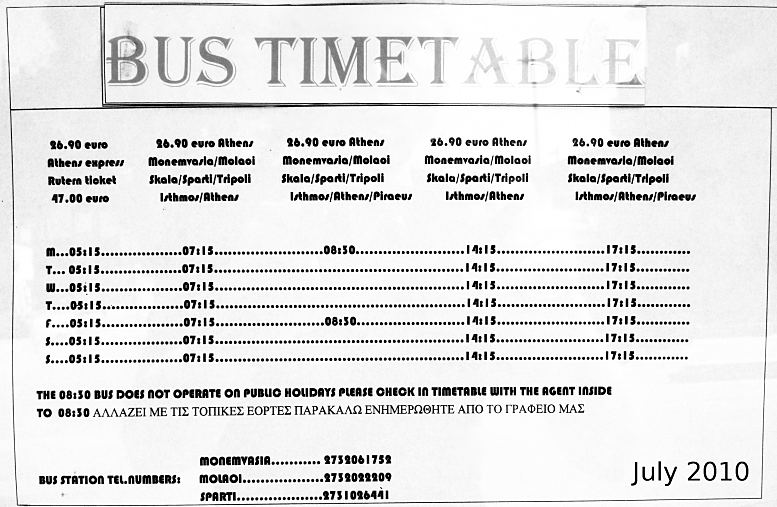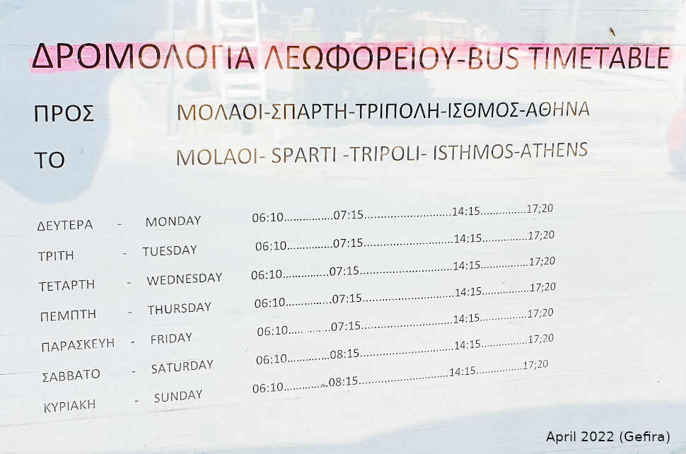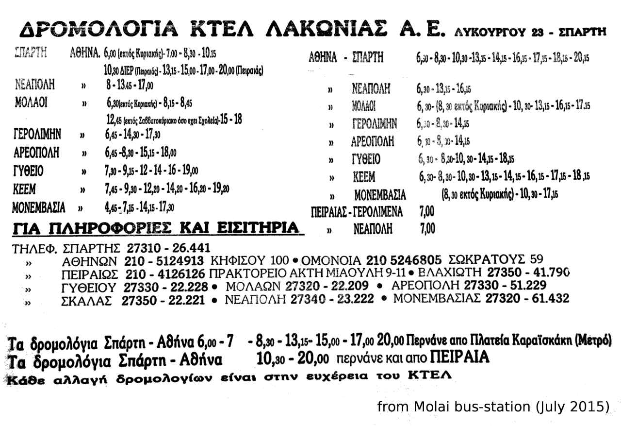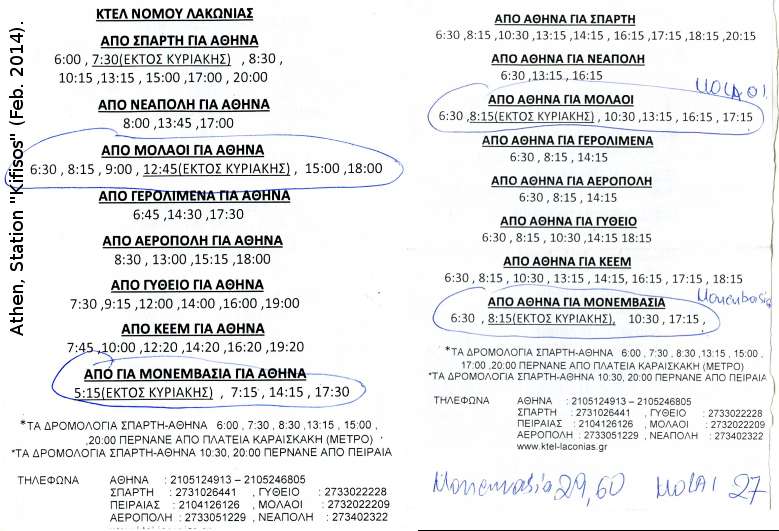 Busfahrplan Athen - Monemvasia von Februar 2014 vom Fahrkarten-Schalter in Athen, von der Station "Kifisos" (KTEL Athens Bus Station, Terminal A, Geokoordinaten 37.998, 23.699), wo Überlandbusse abfahren/ankommen. Die Station ist vom Flughafen mit dem Öffentlichen Nahverkehr in 1,5 Std., mit dem Taxi in ca. 30 Min. erreichbar.