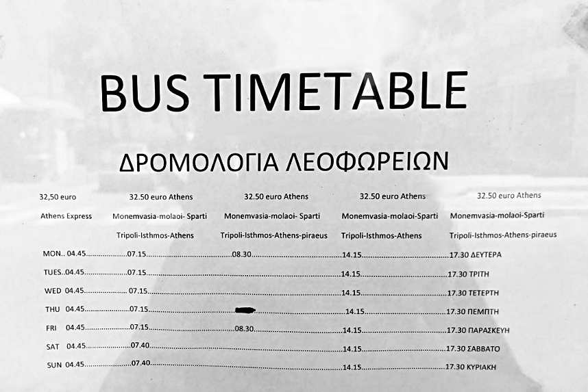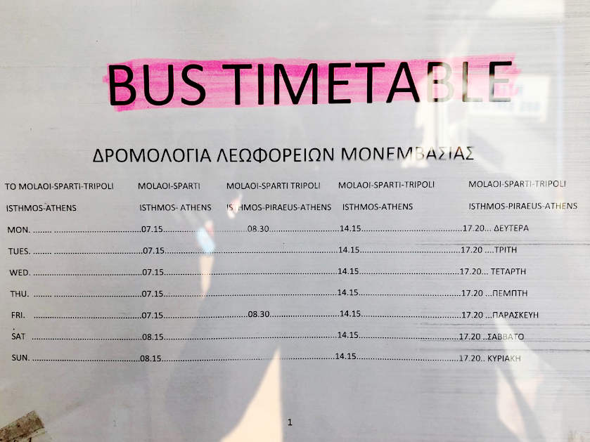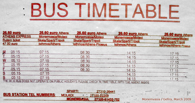 (Athens - Isthmos - Tripoli - Sparti - Skala - Molaoi - Monemvasia: i.R. ca. 5 Stunden Monemv. bis Isthmos), ca. € 32,50.