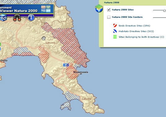 - Karte der Natura 2000-Gebiete um Monemvasia (SPA: Birds Directive Sites = Vogelschutz und SCI: Habitats Directive Sites = ... von gemeinschaftlicher Bedeutung, screenshot) mit Listen wichtiger Tier- und Pflanzenarten (engl.).